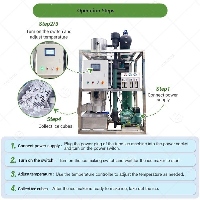 Standard power supply for large capacity tube ice making machine is 3P/ 380V/50HZ, also we can customize it for you. Our ice tube machine are easy to install, ship and operate.